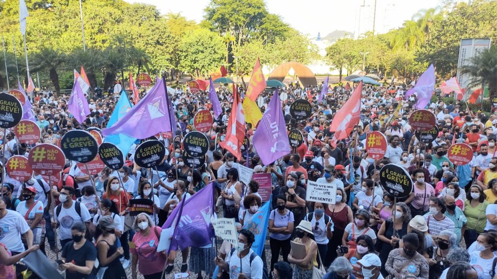 A manifestação contou também com a presença de centenas de professoras e professores da rede de ensino público estadual que, pouco antes, em assembleia diante do prédio da Assembleia Legislativa, no final da tarde, decidiram entrar em greve para reivindicar o pagamento do piso salarial de R$ 3.845 negado pelo governador Romeu Zema.