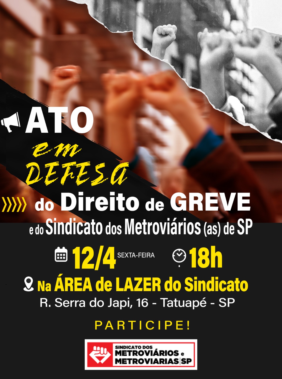 Convidamos a todos e todas para participarem do Ato Em defesa do Direito de Greve e em Defesa do Sindicato que vai ocorrer nesta sexta-feira (12), a partir das 18h, na Área de lazer do sindicato, localizada na rua Serra do Japi, nº 16, no bairro Tatuapé -SP.