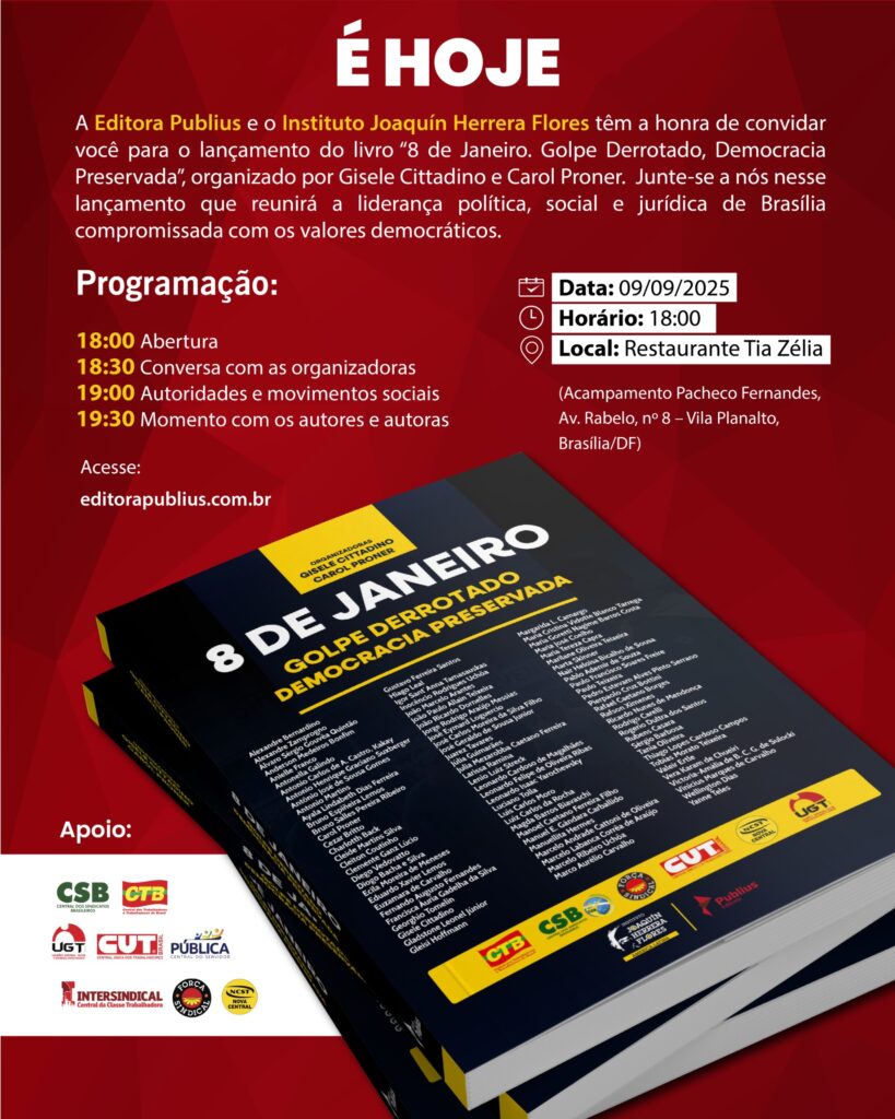A Editora Publius e o Instituto Joaquín Herrera Flores realizam nesta terça-feira (09), em Brasília, o lançamento do livro “8 de Janeiro: Golpe Derrotado, Democracia Preservada”, organizado por Gisele Cittadino e Carol Proner. O evento acontece no Restaurante Tia Zélia, a partir das 18h, e reunirá lideranças políticas, sociais e jurídicas comprometidas com a defesa dos valores democráticos.
