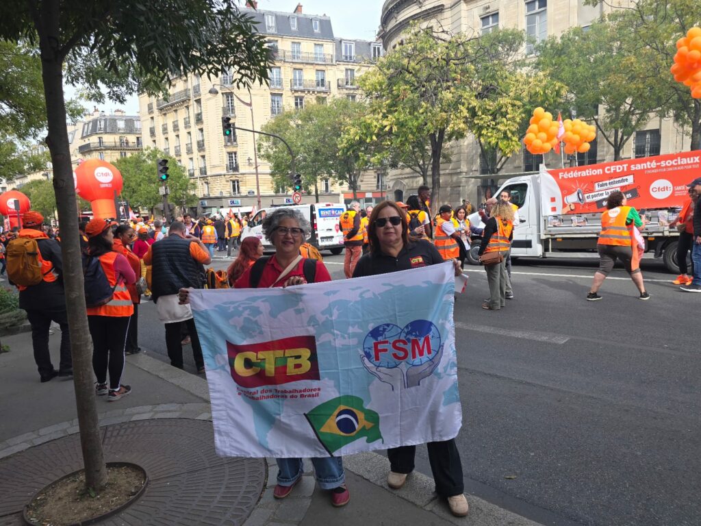 Na véspera da celebração, em 2 de outubro, foi convocada uma greve nacional na França. A CTB se somou à mobilização, convidando os delegados presentes em Paris a participarem da manifestação da greve.