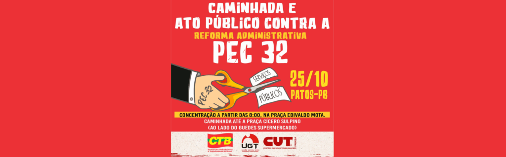 A Central dos Trabalhadores e Trabalhadoras do Brasil na Paraíba, em conjunto com a UGT e a CUT, realizará no próximo dia 25 de outubro, em Patos (PB), uma grande caminhada e ato público contra a Reforma Administrativa (PEC 32). A cidade, que é o berço político do presidente da Câmara dos Deputados, Hugo Mota, foi escolhida simbolicamente como palco da mobilização.
