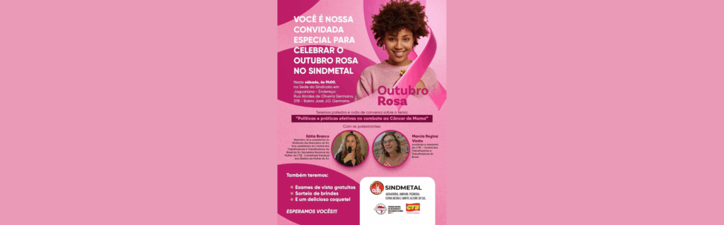 A Central dos Trabalhadores e Trabalhadoras do Brasil (CTB) participa, neste sábado (às 9h), de uma programação especial promovida pelo Sindicato dos Metalúrgicos (Sindmetal) em alusão ao Outubro Rosa, campanha mundial de conscientização sobre a prevenção e o combate ao câncer de mama. O evento será realizado na sede do Sindmetal em Jaguariúna, na Rua Alcides de Oliveira Germano, 378 – Bairro José J.O. Germano.