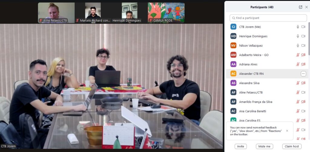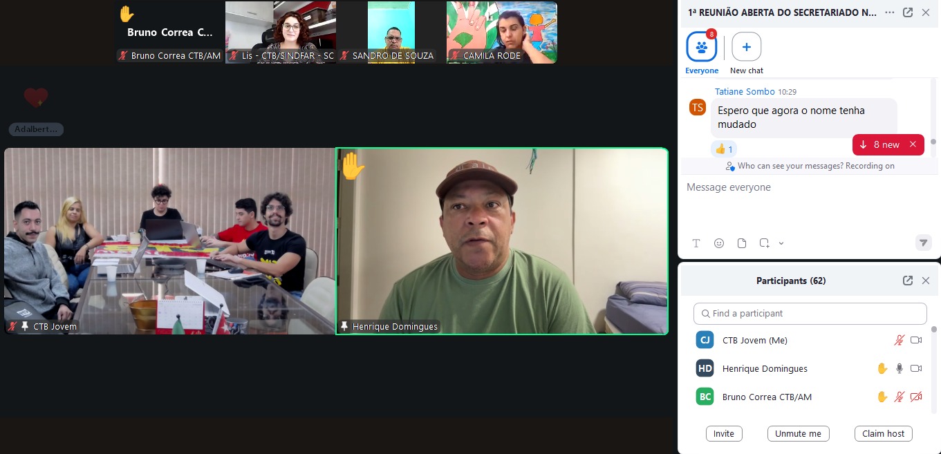 A CTB Jovem realizou, nesta quarta-feira (19), a primeira reunião aberta do secretariado nacional, em formato híbrido, diretamente da sede da CTB, em São Paulo, com transmissão online. O encontro reuniu mais de 50 participantes de vários estados, demonstrando o avanço do processo de reorganização da juventude trabalhadora dentro da Central.