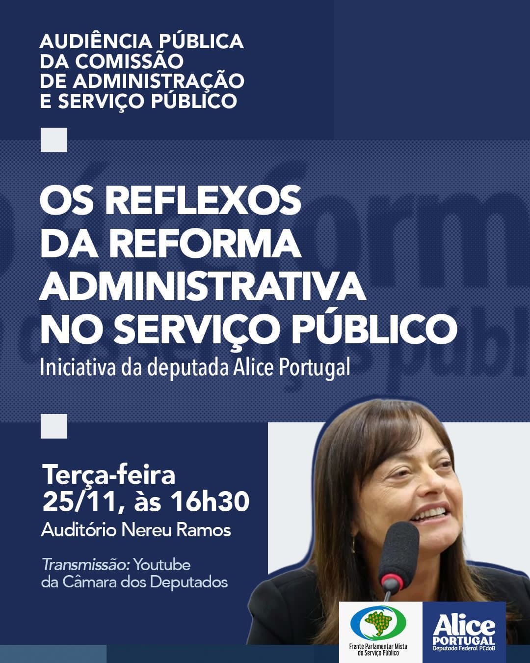 A Comissão de Administração e Serviço Público da Câmara dos Deputados promove, nesta terça-feira (25), às 16h30, uma audiência pública para discutir os reflexos da Reforma Administrativa no serviço público brasileiro. A atividade, iniciativa da deputada federal Alice Portugal (PCdoB-BA), integra uma série de debates sobre o futuro do Estado e a qualidade dos serviços oferecidos à população.