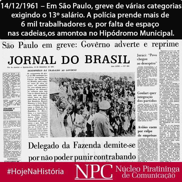 Esse processo culminou na greve de dezembro de 1961, liderada principalmente pelos sindicatos dos metalúrgicos e dos trabalhadores têxteis de São Paulo. A paralisação exigia a aprovação do 13º salário e ganhou grandes proporções. A resposta do Estado foi dura: o movimento foi declarado ilegal, sindicatos foram cercados pela polícia e milhares de trabalhadores foram presos. Em São Paulo, mais de seis mil grevistas chegaram a ser detidos e mantidos no Hipódromo Municipal por falta de espaço nas cadeias.