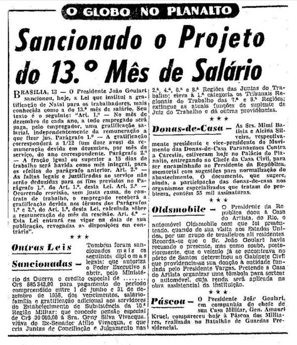A conquista, porém, não foi imediata para toda a classe trabalhadora. Inicialmente, trabalhadores rurais e servidores públicos ficaram de fora do direito. Em 1963, o benefício foi estendido aos aposentados. Em 1965, já sob a ditadura militar, foi regulamentado o pagamento em duas parcelas. Somente com a Constituição Federal de 1988 o 13º salário passou a ser garantido aos trabalhadores urbanos e rurais, sendo posteriormente estendido também aos servidores públicos.