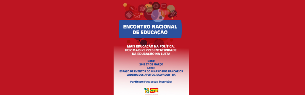 A Central dos Trabalhadores e Trabalhadoras do Brasil (CTB) promove, nos dias 26 e 27 de março, em Salvador (BA), o **Encontro Nacional de Educação – “Mais Educação na Política!”, que reunirá dirigentes sindicais, educadores e representantes políticos para discutir o fortalecimento da educação pública e a ampliação da participação da categoria nos espaços de decisão.