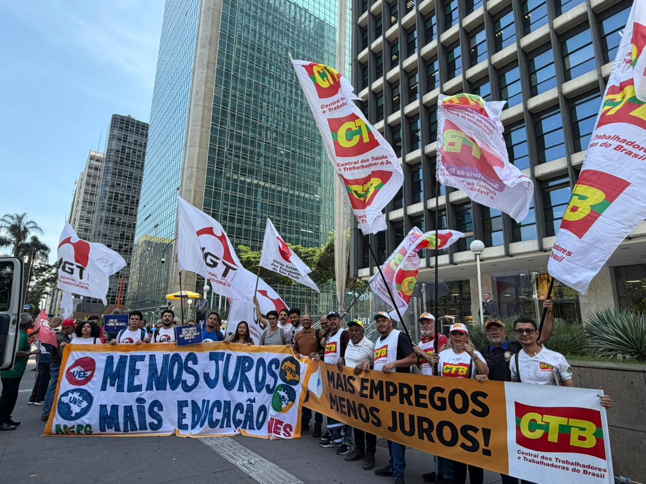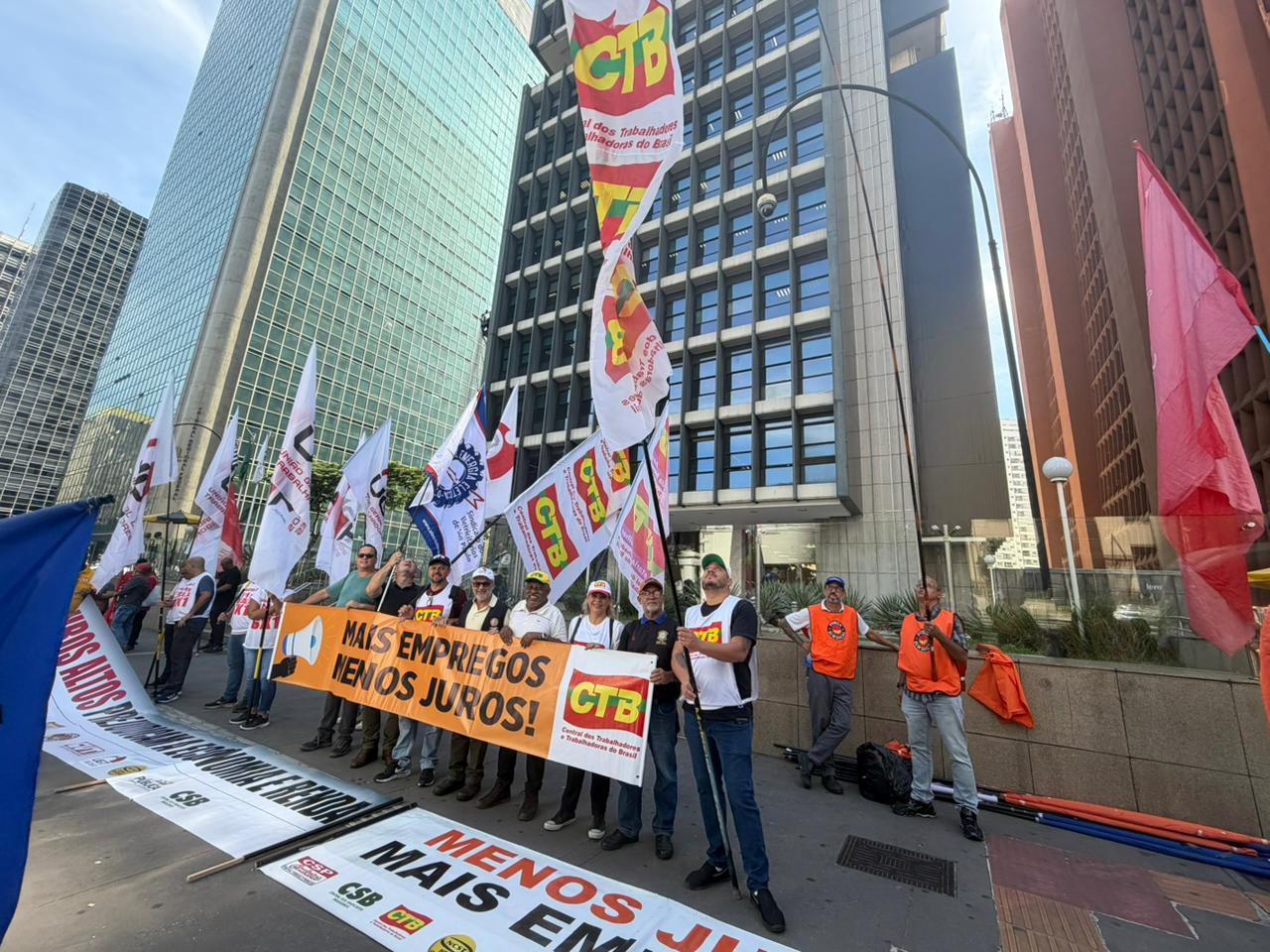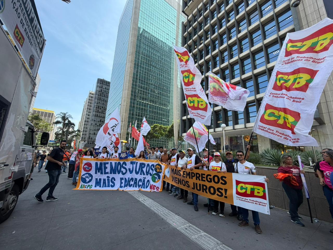 A Central dos Trabalhadores e Trabalhadoras do Brasil (CTB) participou de um ato em defesa da redução da taxa básica de juros (Selic), realizado na véspera da reunião do Comitê de Política Monetária (Copom), do Banco Central. A mobilização reuniu representantes de diversas centrais sindicais e teve como foco a retomada do crescimento econômico, com geração de emprego e renda.