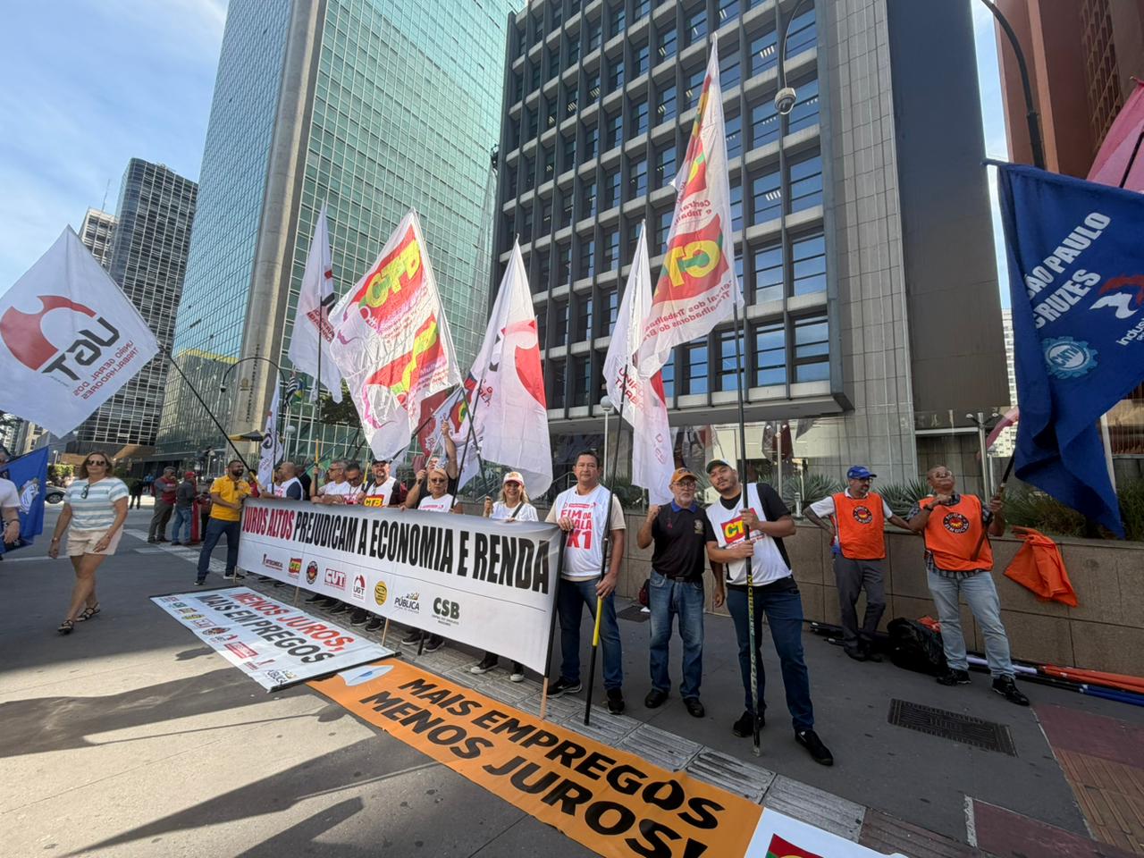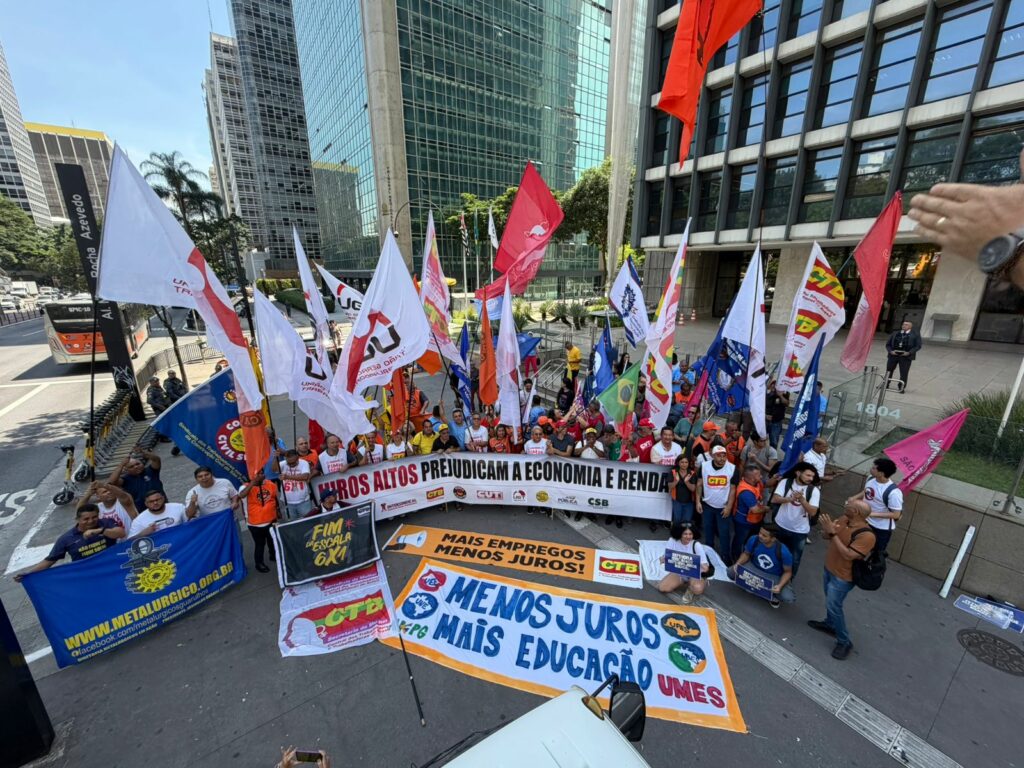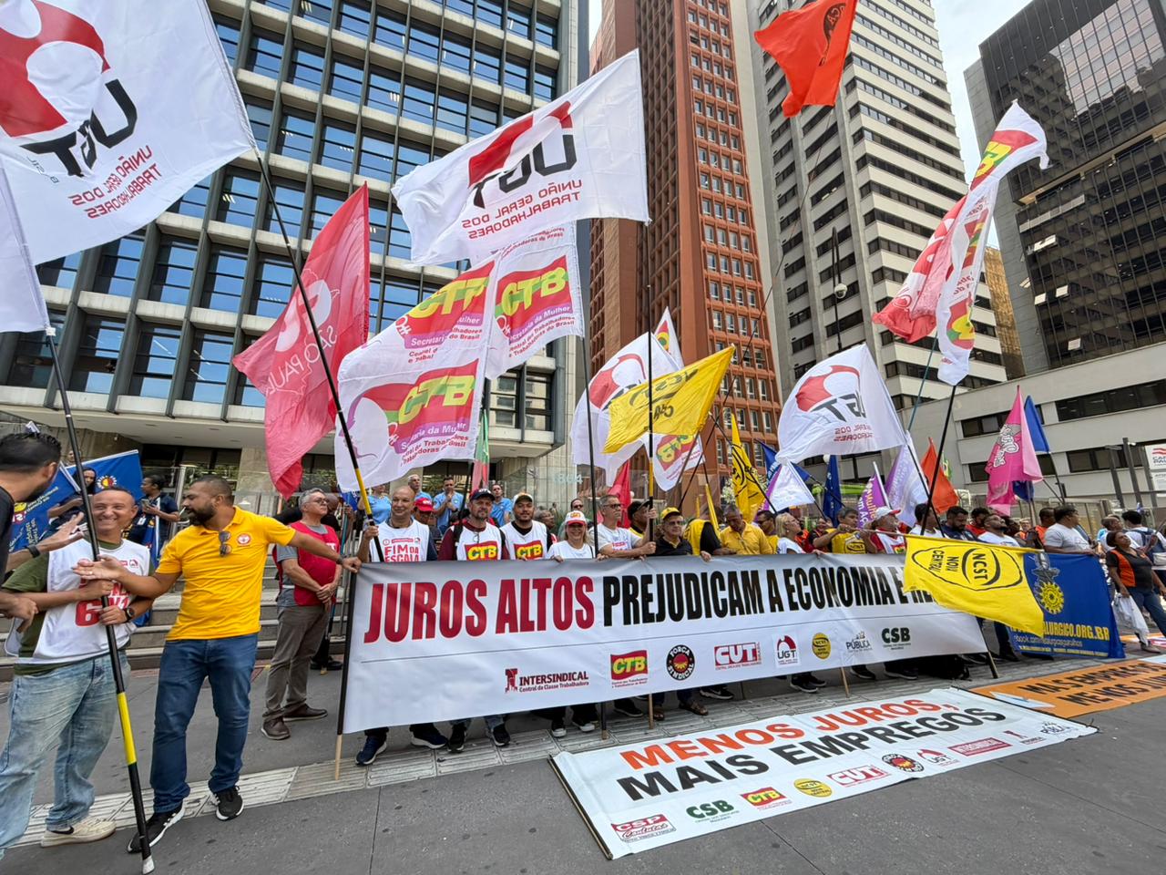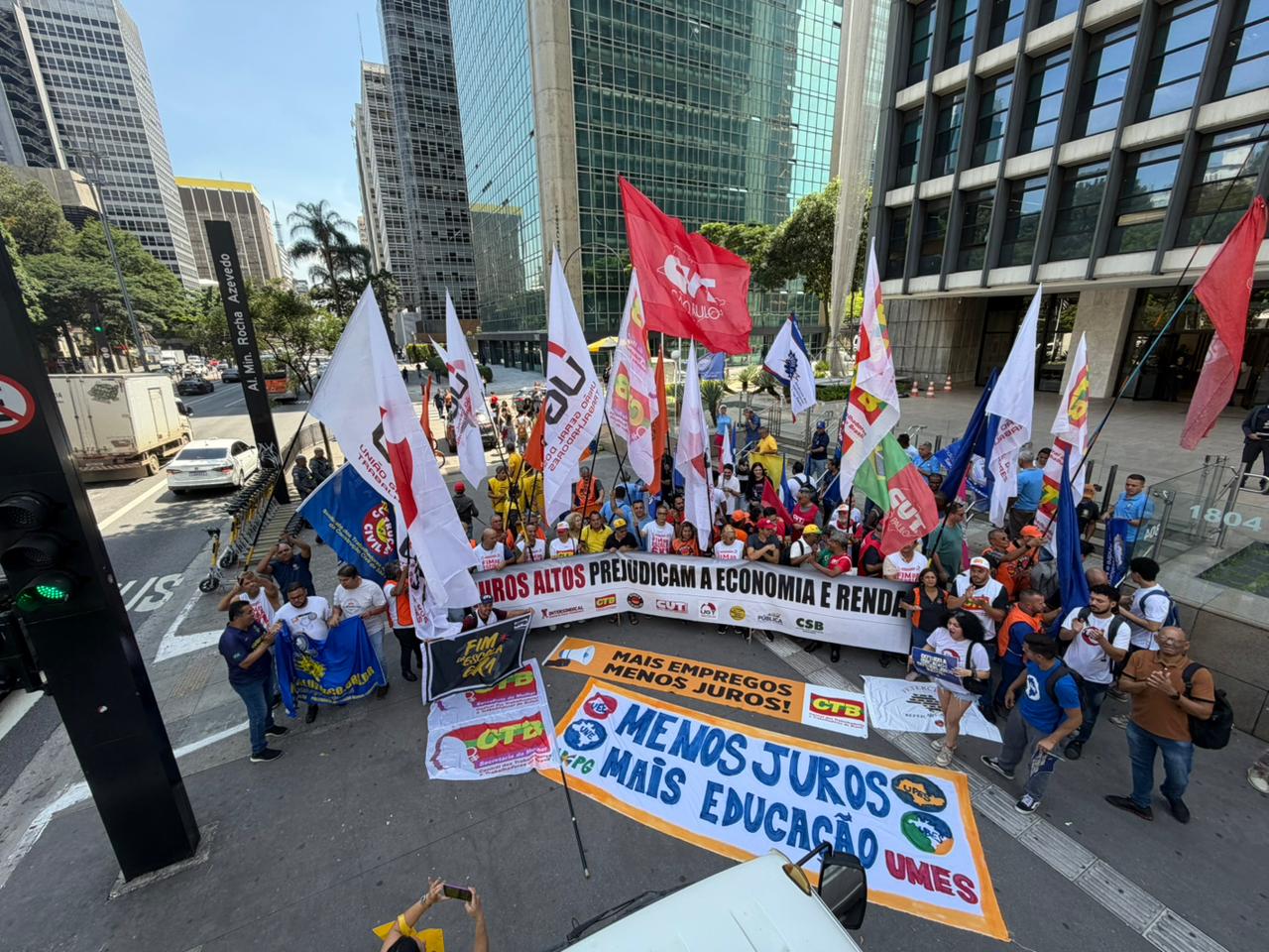 Durante a atividade, os manifestantes reforçaram a cobrança por uma redução imediata da taxa de juros, com palavras de ordem em defesa da economia e do poder de compra da população.
