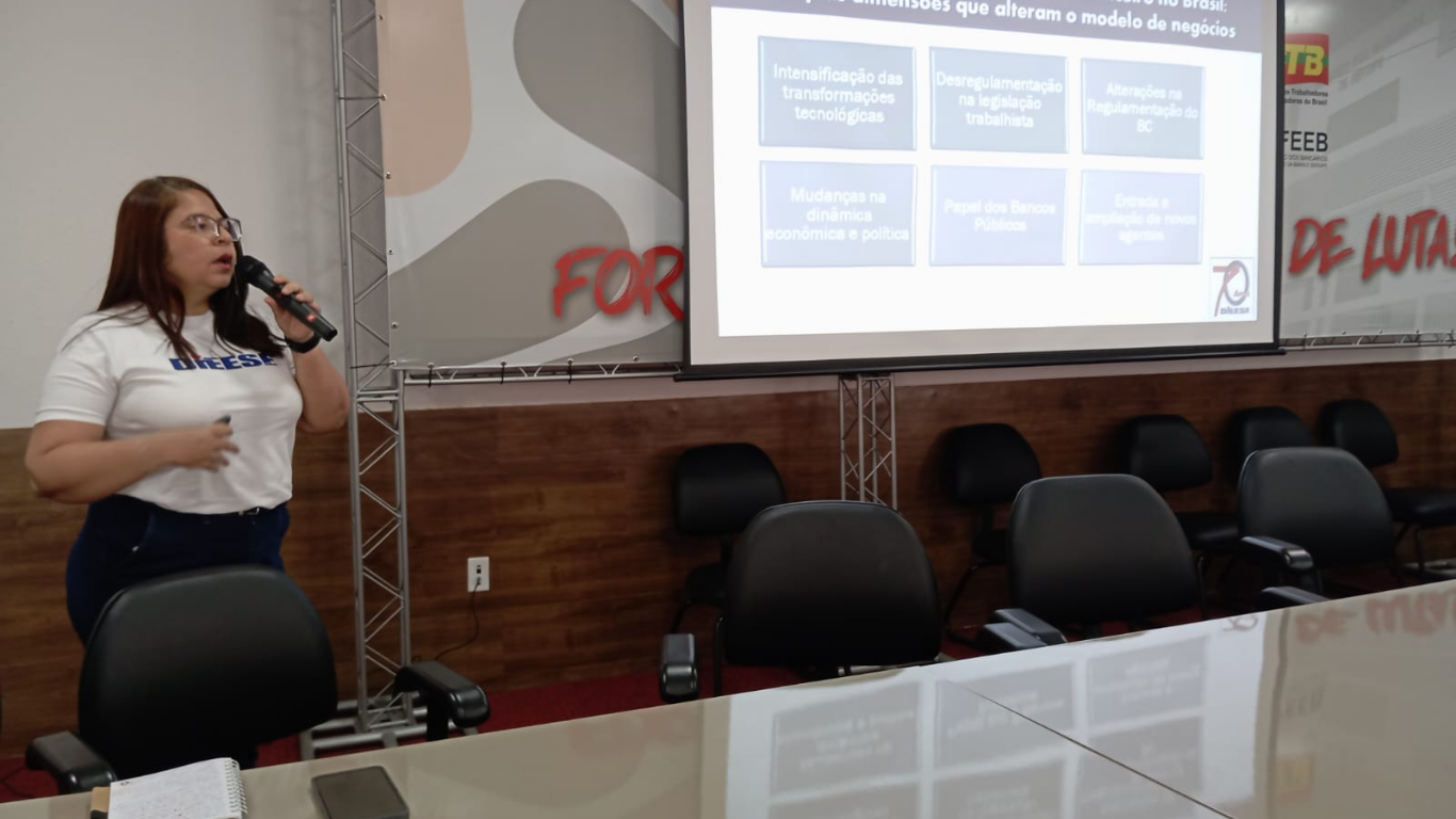 Em seguida, a economista e supervisora técnica do DIEESE/SE, Flávia Santana, abordou as mudanças recentes no perfil da categoria bancária e como essas transformações impactam o processo de negociação coletiva do setor no Brasil.