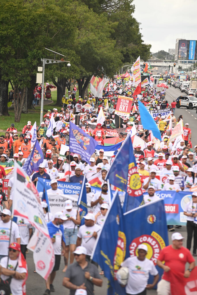Com bandeirões, bandeiras e faixas, a CTB levou às ruas da capital federal mensagens em defesa do fim da escala 6×1, contribuindo para dar visibilidade a uma das principais bandeiras do movimento sindical na atualidade. A identidade visual da campanha esteve presente ao longo de todo o percurso da marcha, reforçando o engajamento da central na mobilização nacional.