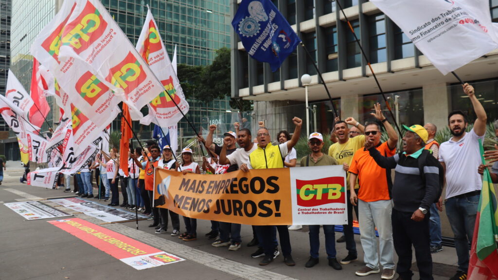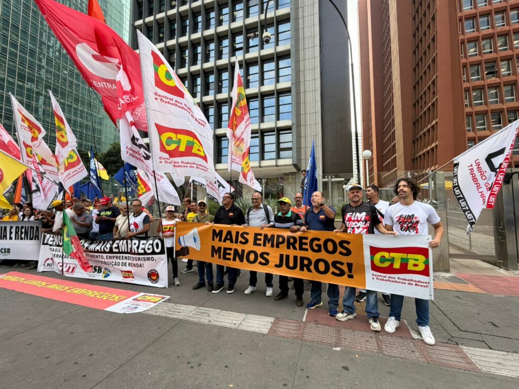 A Central dos Trabalhadores e Trabalhadoras do Brasil (CTB) participou de ato realizado nesta terça-feira (28), em frente ao Banco Central, na Avenida Paulista, contra os juros elevados no país. A mobilização reuniu centrais sindicais, trabalhadores e lideranças de diversas categorias, com forte participação da CTB na condução das falas e na organização do protesto.