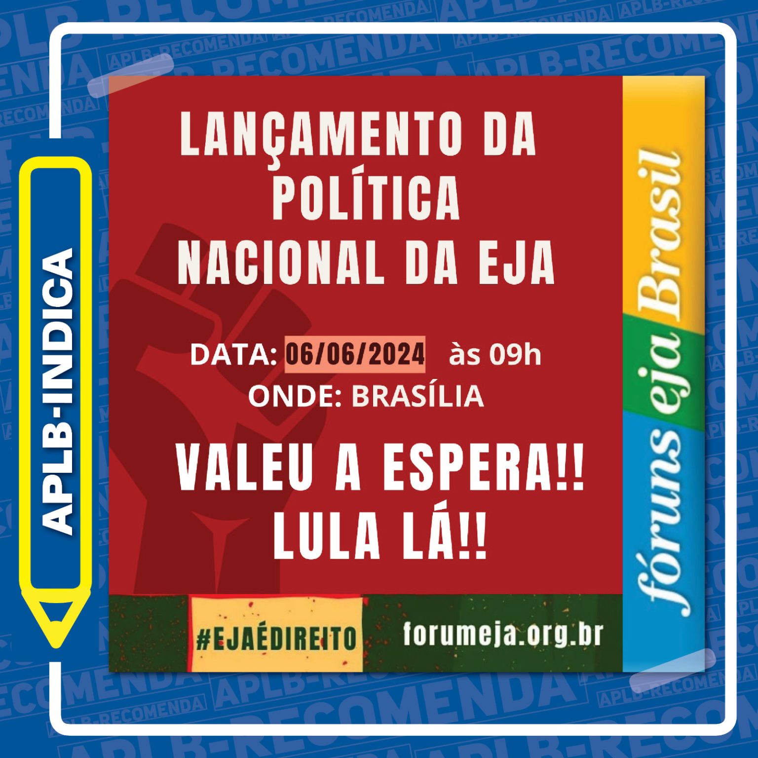 A APLB-Sindicato recomenda a participação de educadores no lançamento da “Política Nacional da Educação de Jovens e Adultos (EJA)”, no