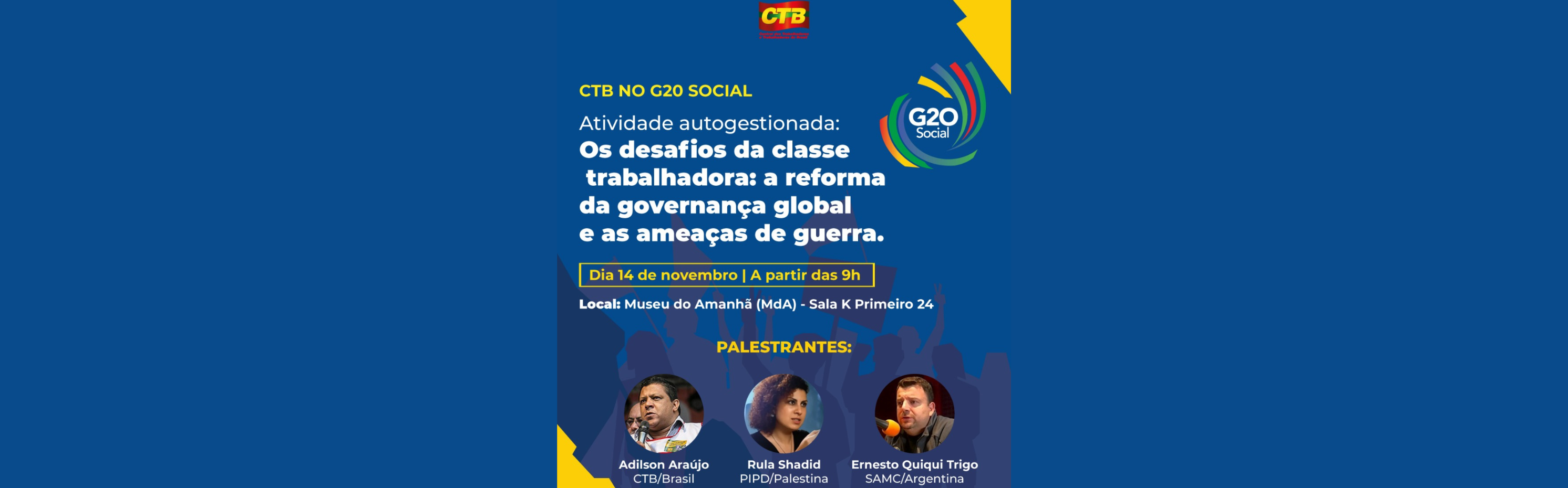 A Central dos Trabalhadores e Trabalhadoras do Brasil (CTB) marcará presença no G20 Social com uma atividade autogestionada de grande